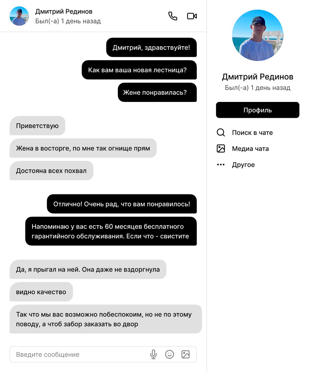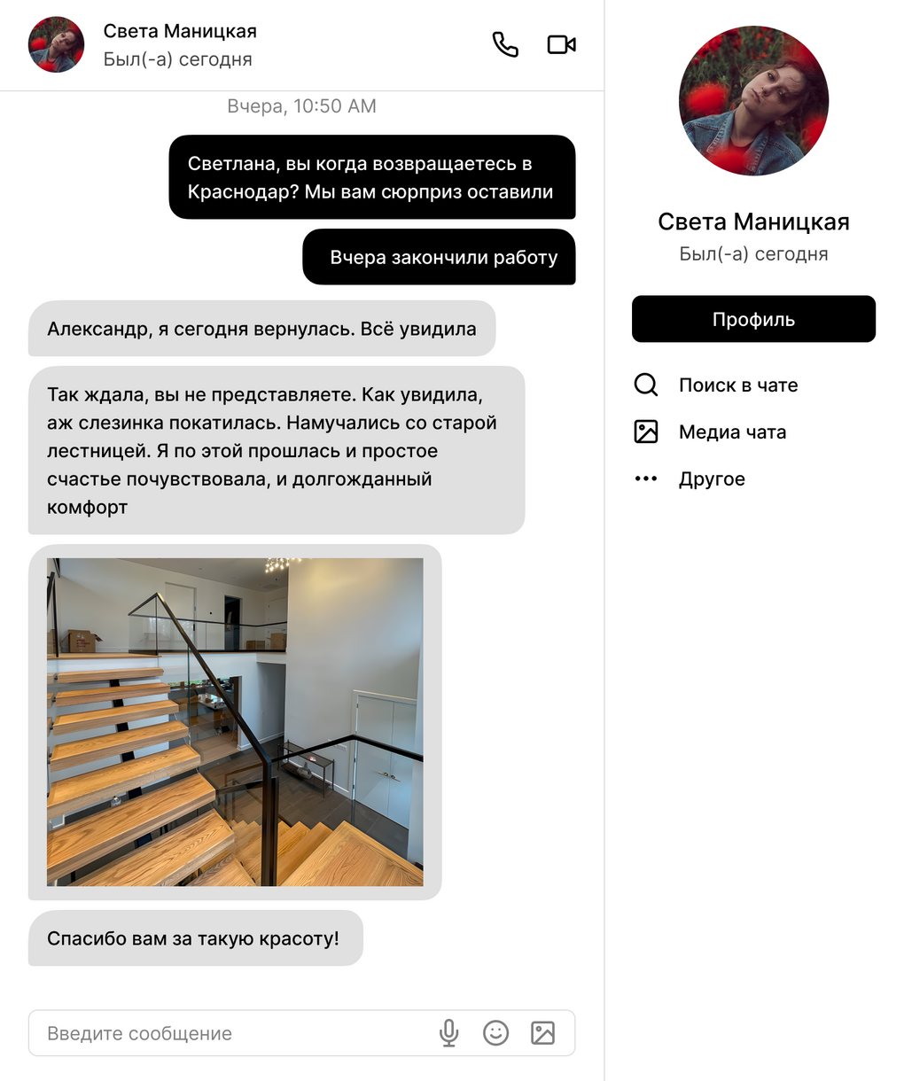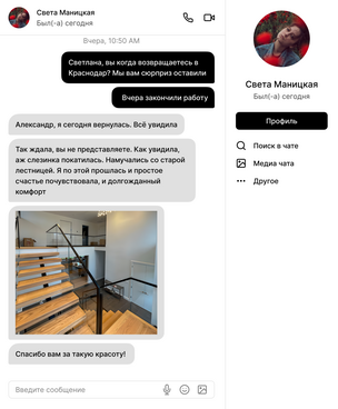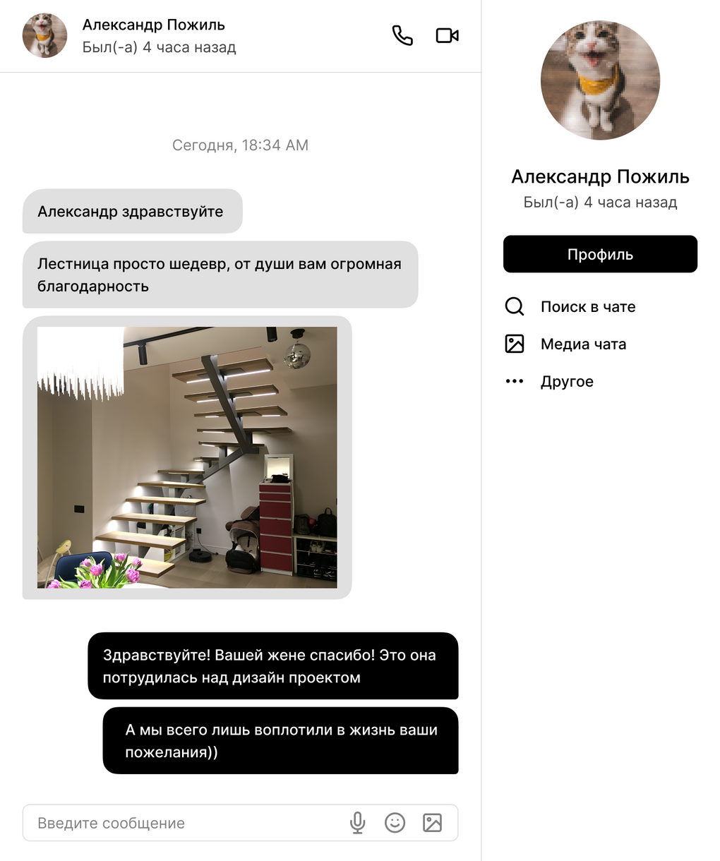 "При выборе компании для изготовления лестницы для моего дома, предоставление 3D проекта лестницы стало решающим фактором. Это позволило мне точно представить будущий дизайн и обеспечило уверенность в правильности выбора. Благодарю команду за профессионализм и внимание к деталям, которые сделали мою лестницу идеальной"